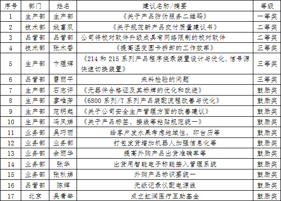 虹潤公司2020年度合理化建議獲獎名單
